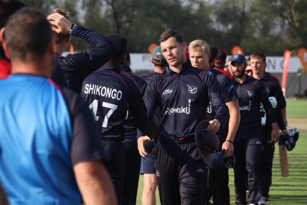नामिबियाका लागि बर्नार्ड स्कोल्ट्जले तीन, जान फ्राइलिंक र जन निकोलले दुई/दुई तथा रुवेन ट्रम्पलम्यान र कप्तान गर्हार्ड इरास्मसले एक/एक विकेट लिए ।