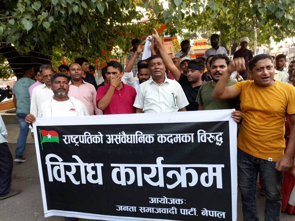 राष्ट्रपतिको कदम असंवैधानिक भएको भन्दै मधेसवादी दलहरू बुधबारदेखि नै आन्दोलित भएका छन् । यसअघि बुधबार जसपाका नेता कार्यकर्ताहरूले जनकपुरधाममा राष्ट्रपति भण्डारीको पुत्लासमेत जलाएका थिए ।