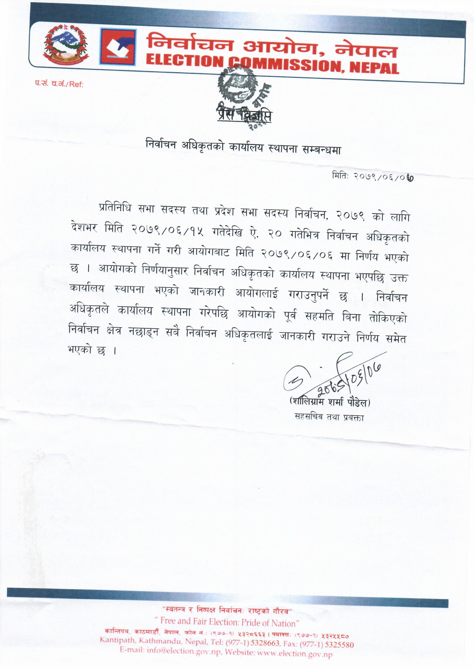 त्यस्तै निर्वाचन अधिकृतहरूलाई पूर्व सहमति बिना तोकिएको निर्वाचन क्षेत्र नछाड्न पनि विज्ञप्ति मार्फत भनिएको छ ।