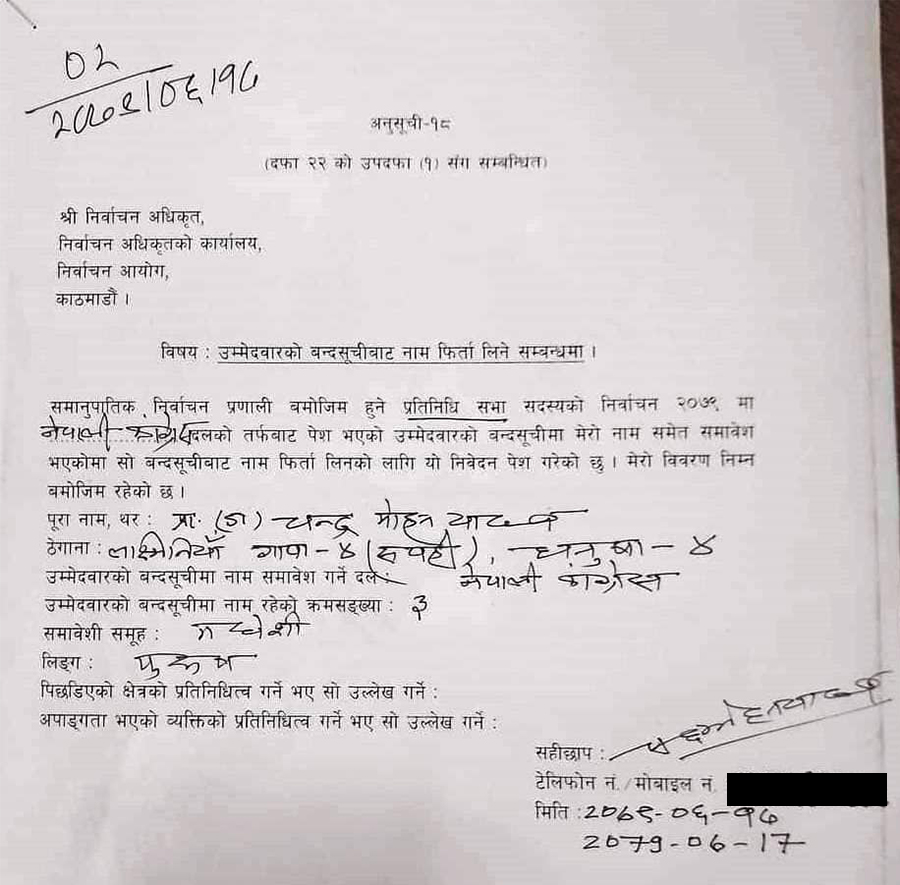 बरियता क्रम नमिलाई आफ्नो नाम बन्दसूचिमा राखेको भन्दै उनले आफ्नो नाम फिर्ता लिन निवेदन दिएका हुन् ।