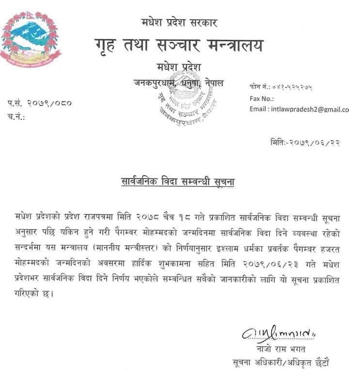 मधेस प्रदेशको प्रदेश राजपत्रमा मिति २०७८ चैत्र १८ गते प्रकाशित सार्वजनिक विदा सम्वन्धी सूचना अनुसार पछि यकिन हुने गरी पैगम्बर मोहम्मदको जन्मदिनमा सार्वजनिक विदा दिने व्यवस्था रहेको सन्दर्भमा यस मन्त्रालयको निर्णयानुसार प्रदेशभर सार्वजनिक विदा दिने निर्णय भएको उनले बताए ।