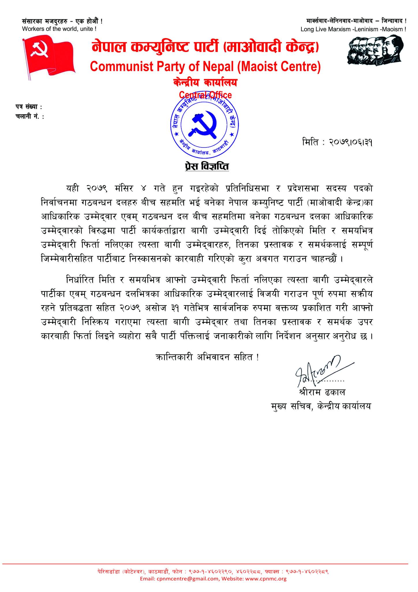 माओवादी पार्टी केन्द्रीय कार्यालयका मुख्यसचिव श्रीराम ढकालले जारी गरेको विज्ञप्तिमा निर्वाचन आयोगले तोकेको मितिभित्र उम्मेदवारी फिर्ता नलिने बागी, तिनका प्रस्तावक र समर्थकलाई कारबाही गरिसकिएको र अझै प्रदेश र प्रतिनिधिसभाका बागी र स्वतन्त्र उम्मेदवारी दिनेले सोमबारसम्म पार्टी वा गठबन्धनका आधिकारिक उम्मेदवारलाई विजयी गराउने प्रतिबद्धतासहित घोषणा गरे अनुशासनको कारबाही नहुने जनाइएको छ ।