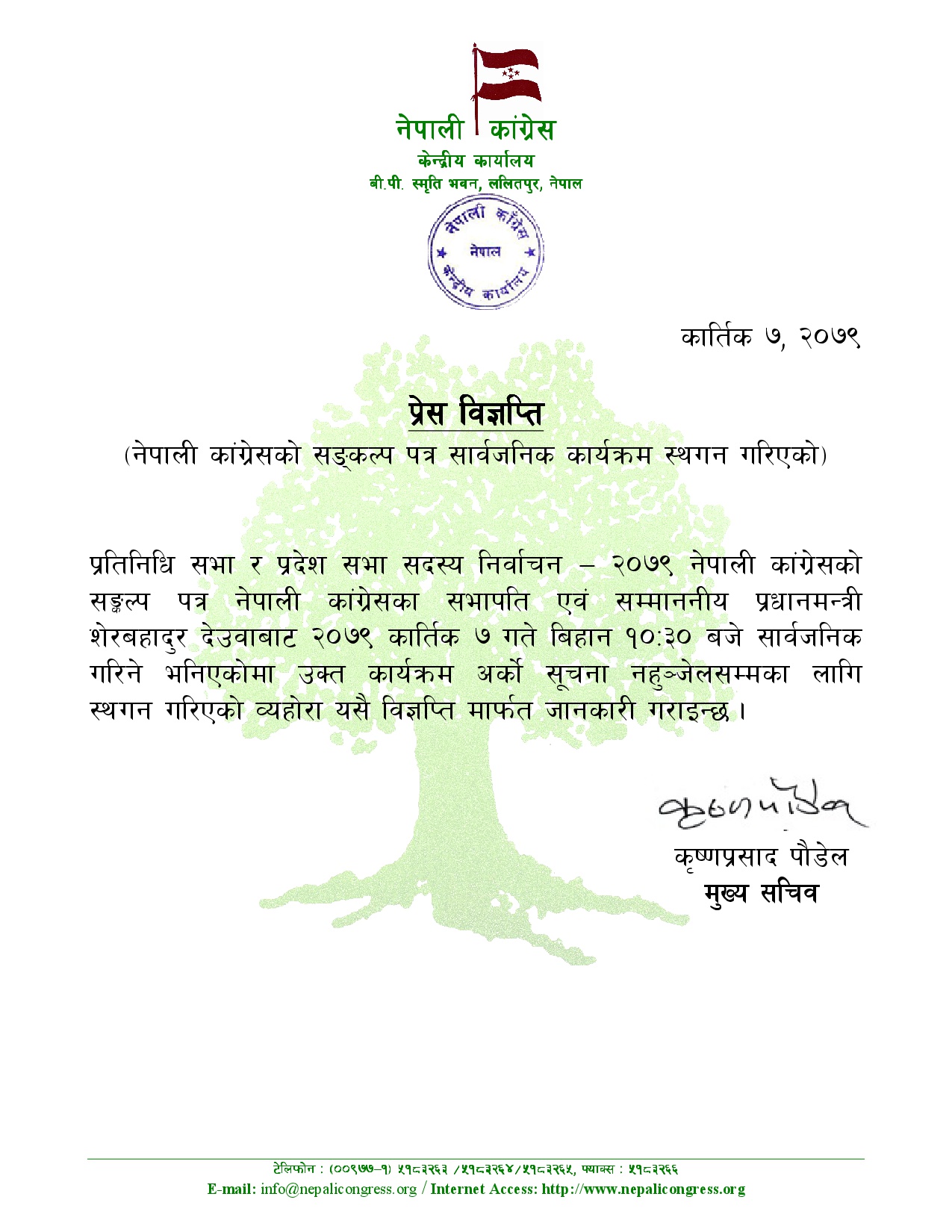 कांग्रेसको घोषणा पत्र सार्वजनिक गर्ने कार्यक्रम फेरि स्थगित