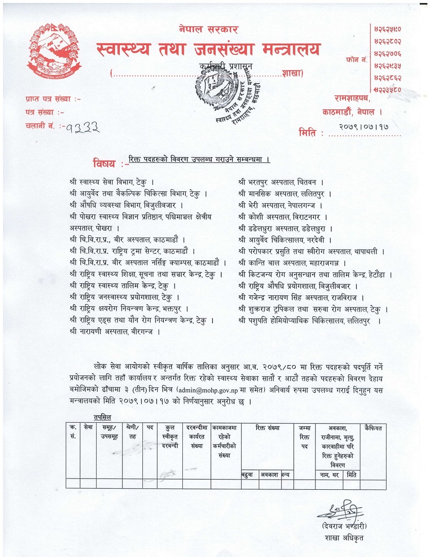 रिक्त पदहरुको विवरण उपलब्ध गराउन २६ स्वास्थ्य संस्थालाई मन्त्रालयको निर्देशन