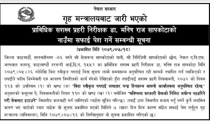 सेवाबाट नहटाउनु पर्ने कुनै कारण भए बाटोको म्याद बाहेक यो सूचना प्रकाशित भएको ७ दिनभित्र स्पष्टीकरण पेश गर्न गृह मन्त्रालयले सूचना जारी गरेको छ ।