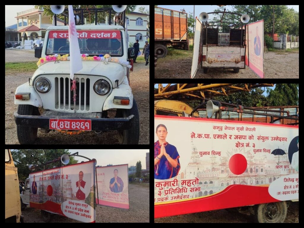 जनकपुरधाम, १९ कार्तिक । आगामी मंसिर ४ गते हुने निर्वाचनको प्रचारप्रसारमा आचारसंहिताको उल्लंघन गरेको भन्दै स्थानीय प्रशासनले उम्मेदवारहरुको सवारी साधन नियन्त्रणमा लिएको छ ।