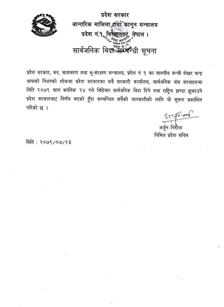 आन्तरिक मामिला तथा कानुन मन्त्रालयका निमित्त प्रदेश सचिव अर्जुन निरौलाले विज्ञप्ति जारी गर्दै मन्त्री थापाको शोकमा प्रदेश सरकारका सबै सरकारी कार्यालय, सार्वजनिक संघ संस्थाहरुमा बिहीबार सार्वजनिक बिदा दिने निर्णय भएको जानकारी दिएका छन् ।