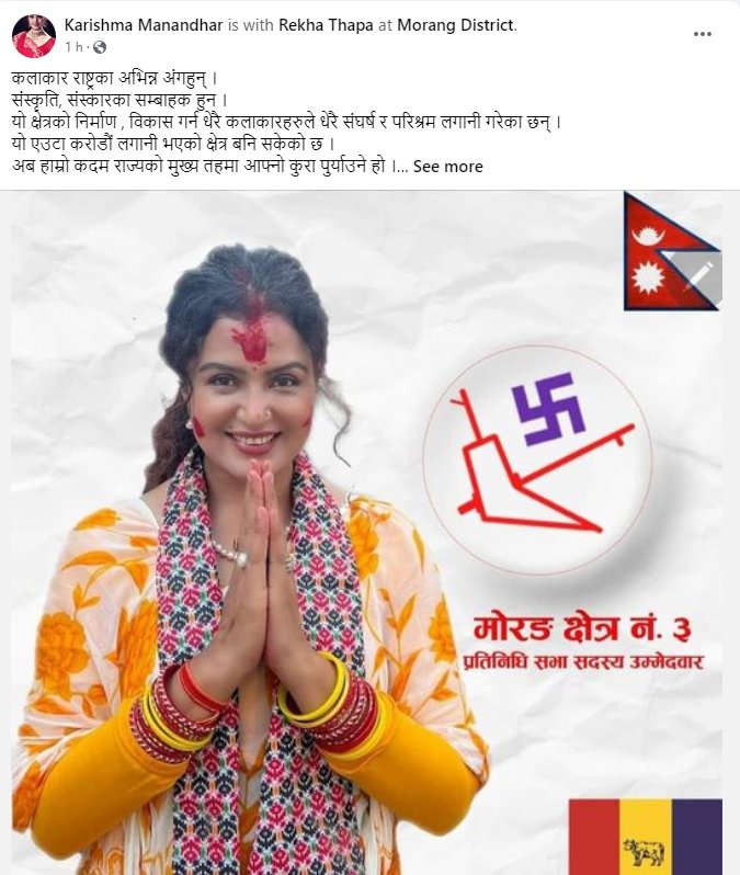 काठमाडौं, २९ कार्तिक । अभिनेत्री करिष्मा मानन्धरले अभिनेत्री रेखाका लागि भोटको अपिल गरेकी छन् । मोरङ–३ बाट राप्रपा उम्मेदवार बनेकी रेखा यसपटक अत्यधिक चर्चित बनेकी छन् ।