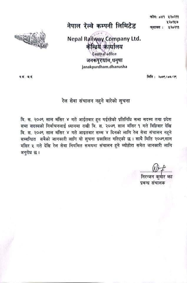 नेपाल रेल्वे कम्पनी लिमिटेडले बुधबार एक सूचना जारी गर्दै आसन्न प्रतिनिधि तथा प्रदेशसभा सदस्यको निर्वाचनलाई मध्यनजर गर्दै बिहीबारदेखि आइतबारसम्म रेल सेवा बन्द गर्न लागेको जनाएको हो ।