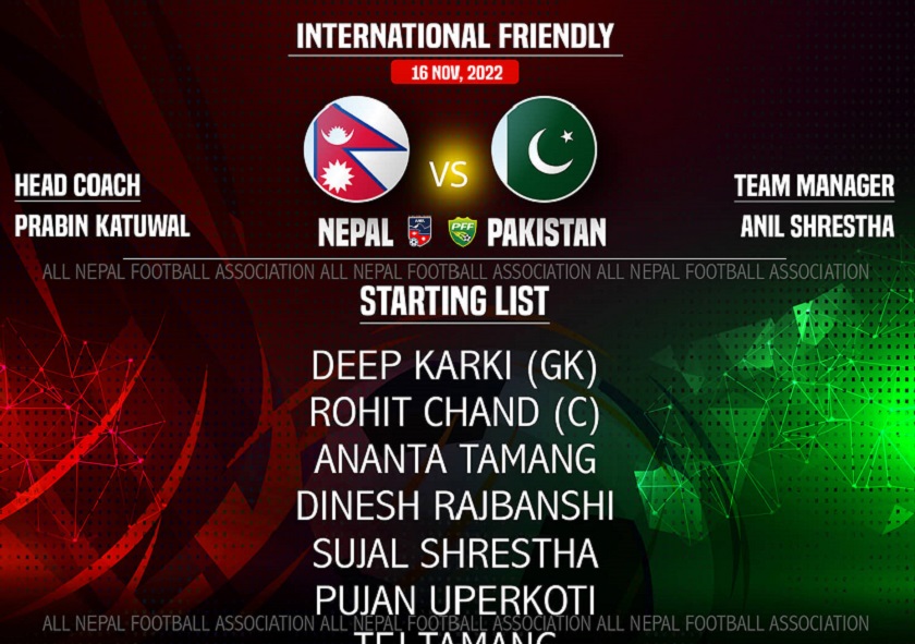 मुख्य प्रशिक्षक प्रवेश कटुवालले रोहित चन्दको कप्तानीमा शुरुवाती–११ सार्वजनिक गरेका हुन् । त्रिपुरेश्वरस्थित दशरथ रंगशालामा हुने नेपाल र पाकिस्तानबीचको खेल साँझ ५ :०० बजे सुरु हुनेछ ।