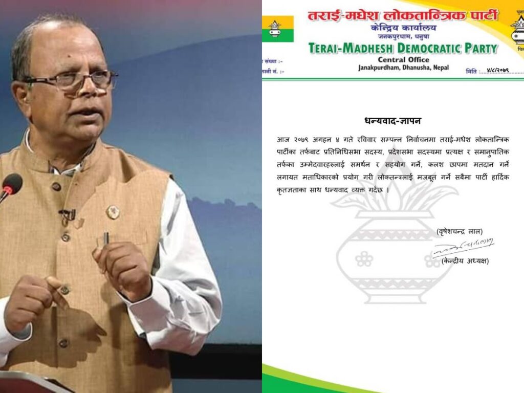 अध्यक्ष लालले विज्ञप्ति जारी गर्दै भनेका छन्, ‘आज २०७९ मंसिर ४ गते आइतबार सम्पन्न निर्वाचनमा तराई–मधेश लोकतान्त्रिक पार्टीका तर्फबाट प्रतिनिधिसभा सदस्य, प्रदेशसभा सदस्यमा प्रत्यक्ष र समानुपातिक तर्फका उम्मेदवारहरुलाई समर्थन र सहयोग गर्ने, कलश छापमा मतदान गर्ने लगायत मताधिकारको प्रयोग गरी लोकतन्त्रलाई मजबूत गर्ने सबैमा तमलोपा हार्दिक कृतज्ञताका साथ धन्यवाद व्यक्त गर्दछ ।’