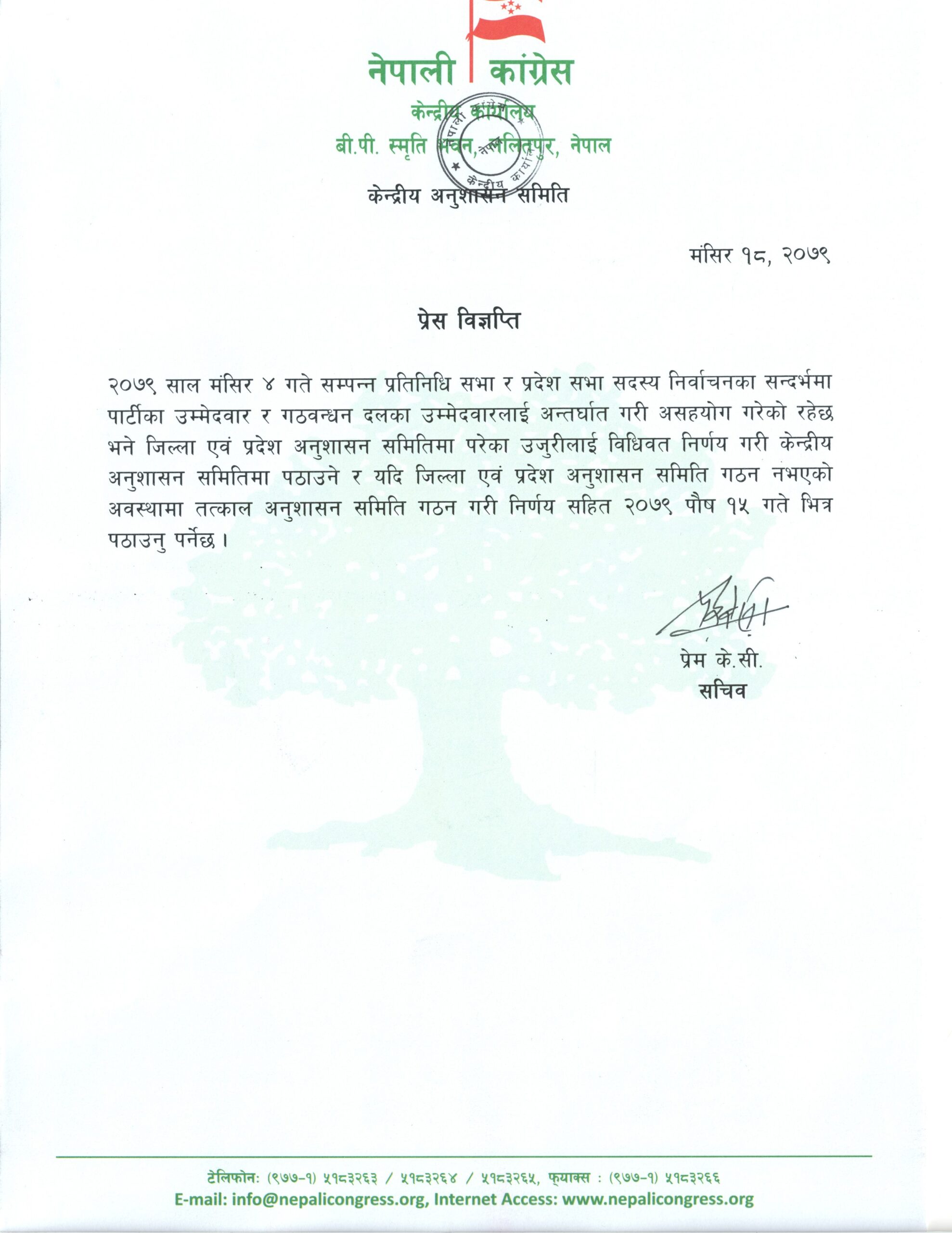 कांग्रेस अनुशासन समितले प्रतिनिधिसभा र प्रदेशसभा सदस्य निर्वाचनमा पार्टी र गठबन्धनका उम्मेदवारलाई अन्तरघात गर्नेहरुको सूची माग गरेको हो ।