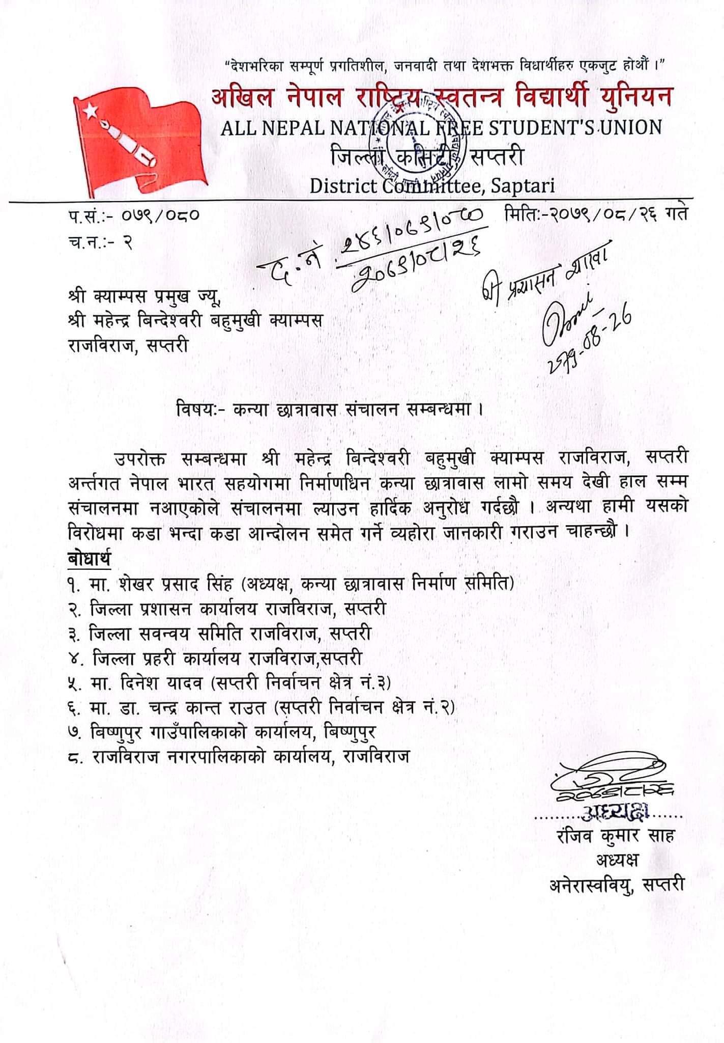 अनेरास्ववियु सप्तरीका अध्यक्ष रंजिव कुमार साहको नेतृत्वमा बर्षौंदेखि क्याम्पसको कन्या छात्रावास अलपत्र रहेकोले यथाशीघ्र संचालन हुनुपर्ने माग गर्दै निवेदन दर्ता गराइएको हो ।