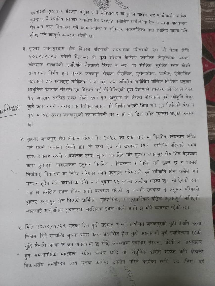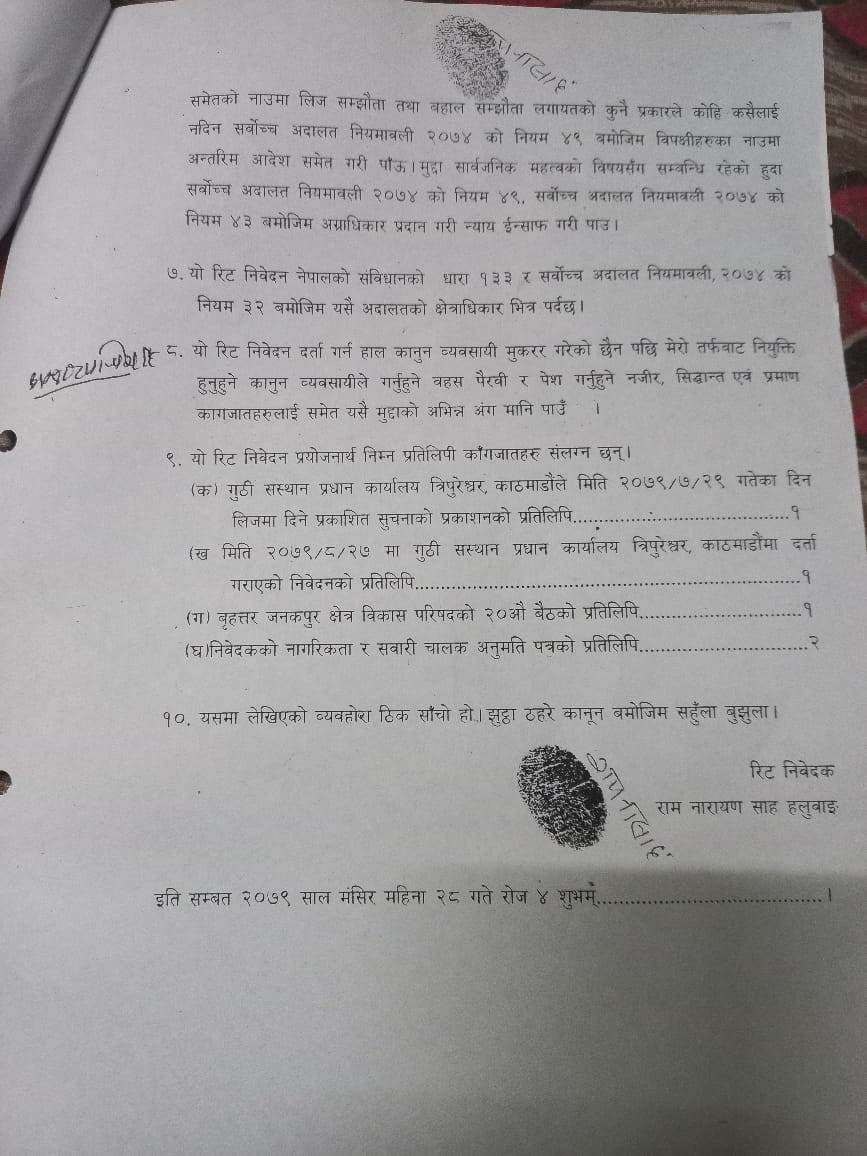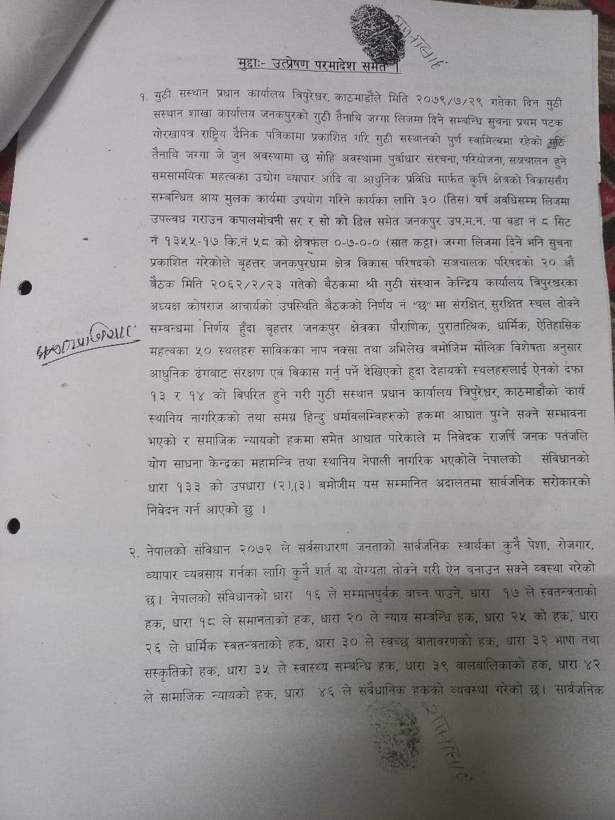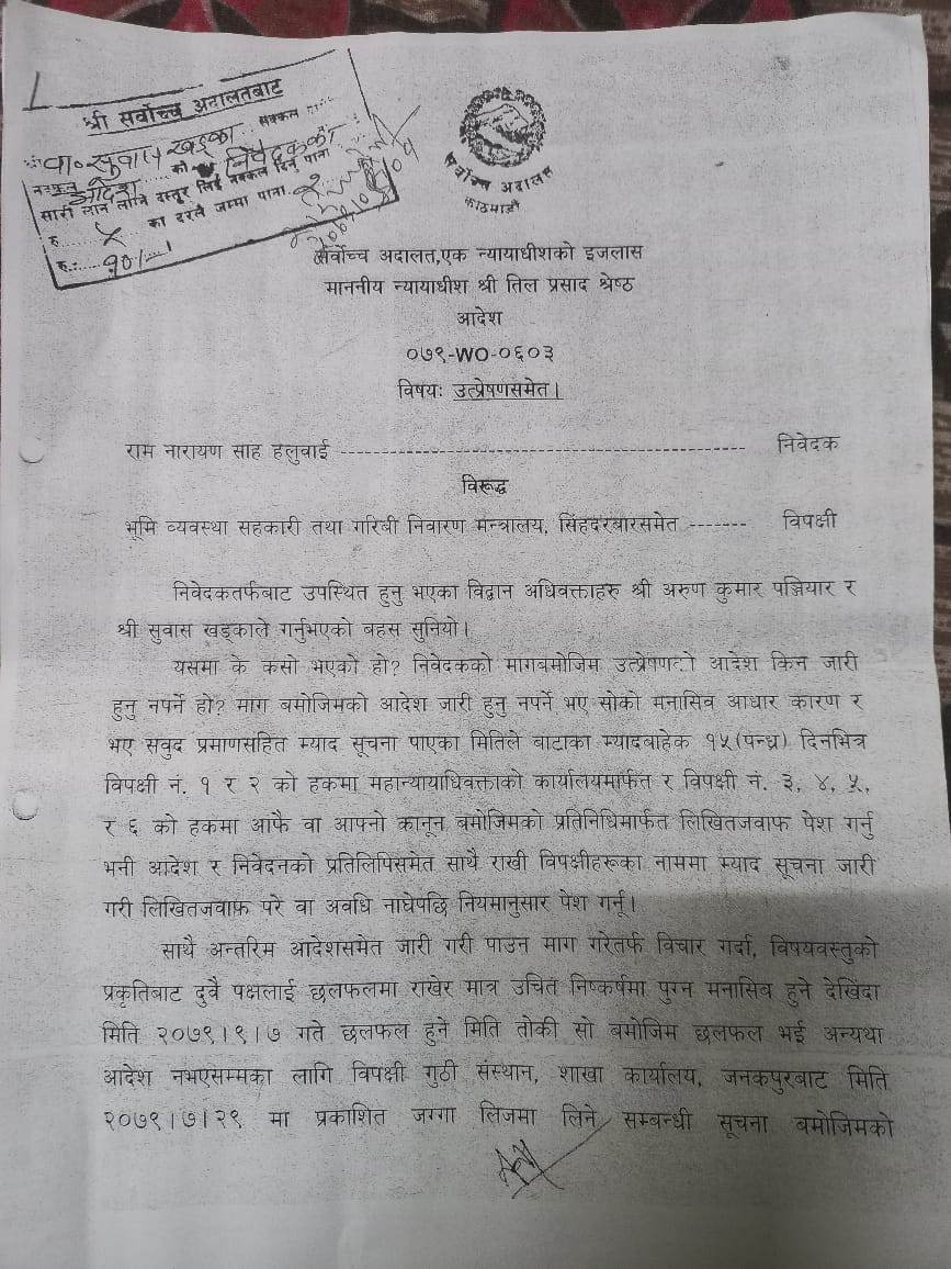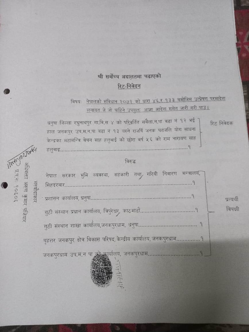 जनकपुरधाम उपमहानगरपालिका–१३ बस्ने ५६ वर्षीय रामनारायण साहले गुठी संस्थानलाई विपक्षी बनाएर दिएको रिट निवेदनमा सर्वोच्चले यस्तो आदेश दिएको हो ।