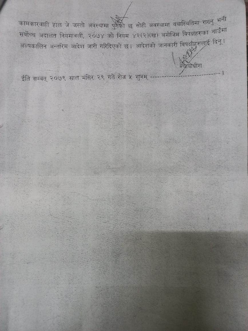 सर्वोच्च अदालत नियमावली, २०७४ को नियम ४२ को २ (ख) बमोजिम विपक्षीको नाउँमा अल्पकालीन अन्तरिम आदेश जारी गरिएको हो ।