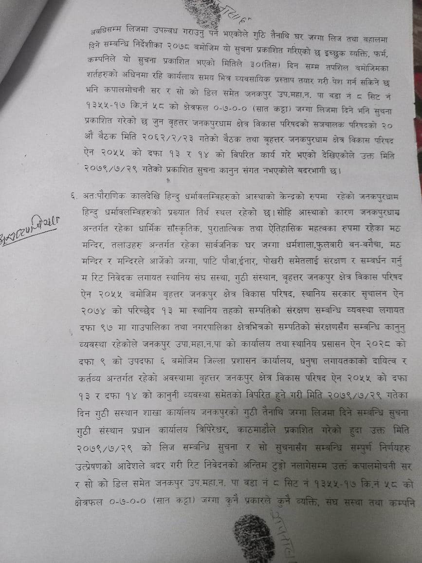 जनकपुरधाम–८ स्थित कपालमोचनी सरको जग्गा तत्काल लिजमा नलगाउन सर्वोच्चको आदेश (पूर्णपाठसहित)