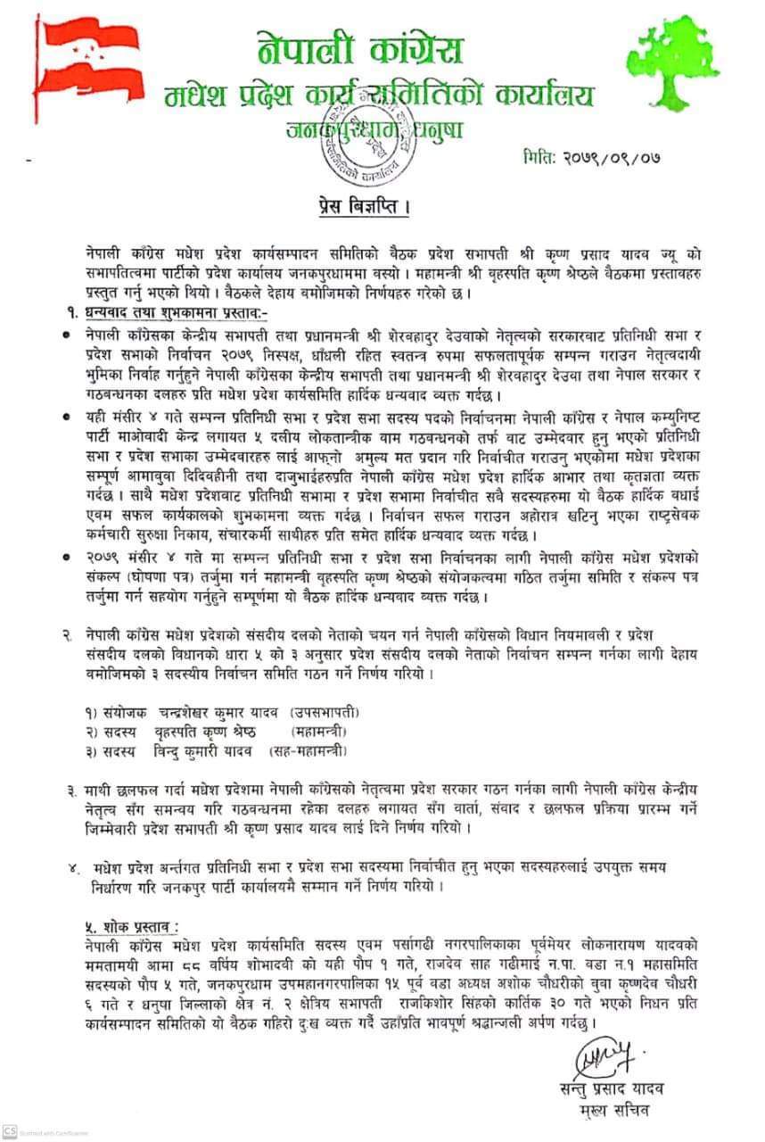 जनकपुरधाम, ७ पुस । नेपाली कांग्रेसले मधेस प्रदेशको संसदीय दलको नेता चयन गर्न निर्वाचन समिति गठन गरेको छ ।