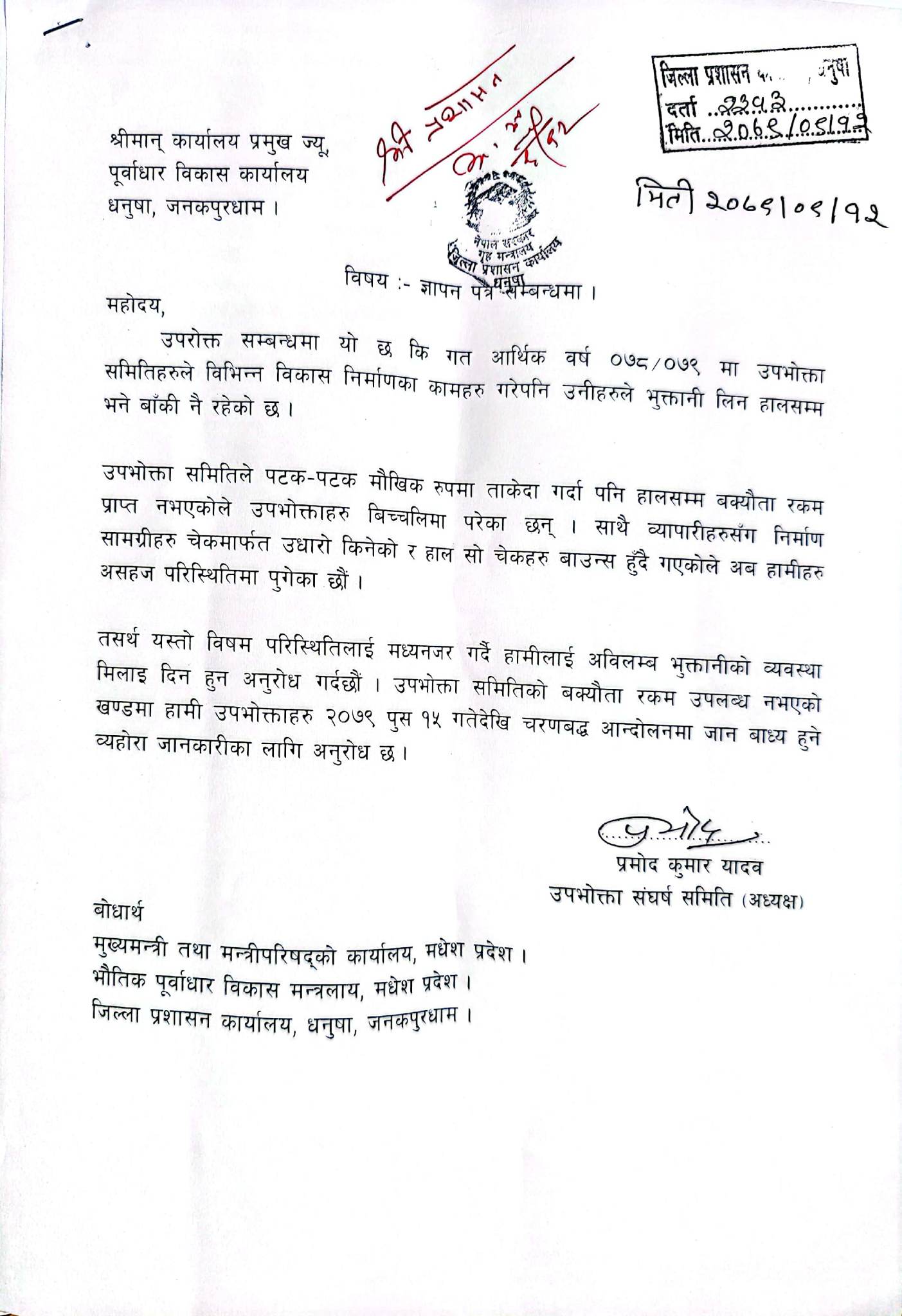 उपभोक्ता संघर्ष समितिका अध्यक्ष प्रमोद कुमार यादवको नेतृत्वमा मधेस प्रदेश सरकारको भौतिक पूर्वाधार विकास मन्त्रालय, जिल्ला प्रशासन कार्यालय र पूर्वाधार विकास कार्यालयमा ज्ञापनपत्र बुझाइएको छ ।