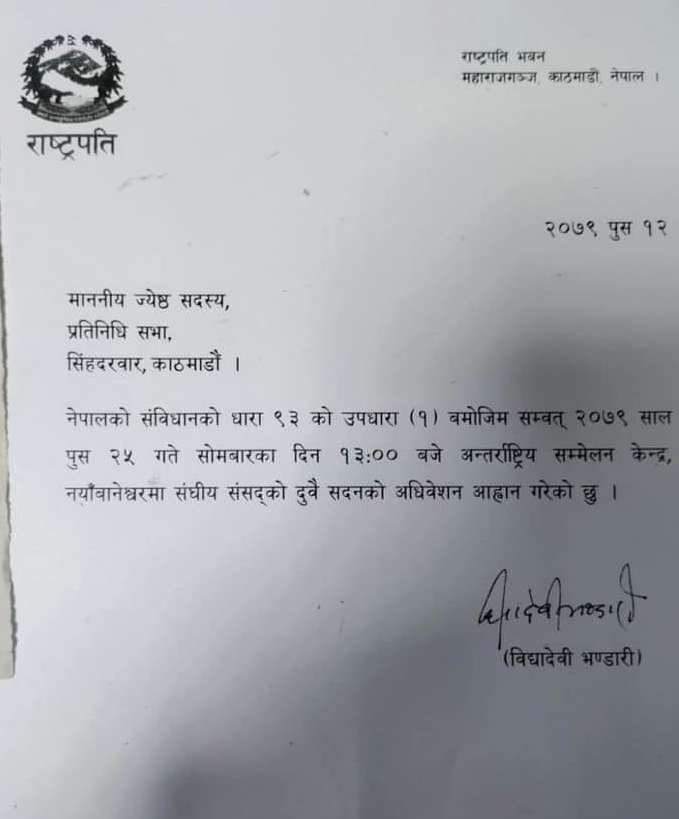 सरकारको सिफारिसमा मंगलबार उनले पुस २५ गते सोमबार दिउँसो १ बजे अन्तर्राष्ट्रिय सम्मेलन केन्द्र नयाँ बानेश्वरमा बस्नेगरी दुवै सदनको अधिवेशन आह्वान गरेकी हुन् ।