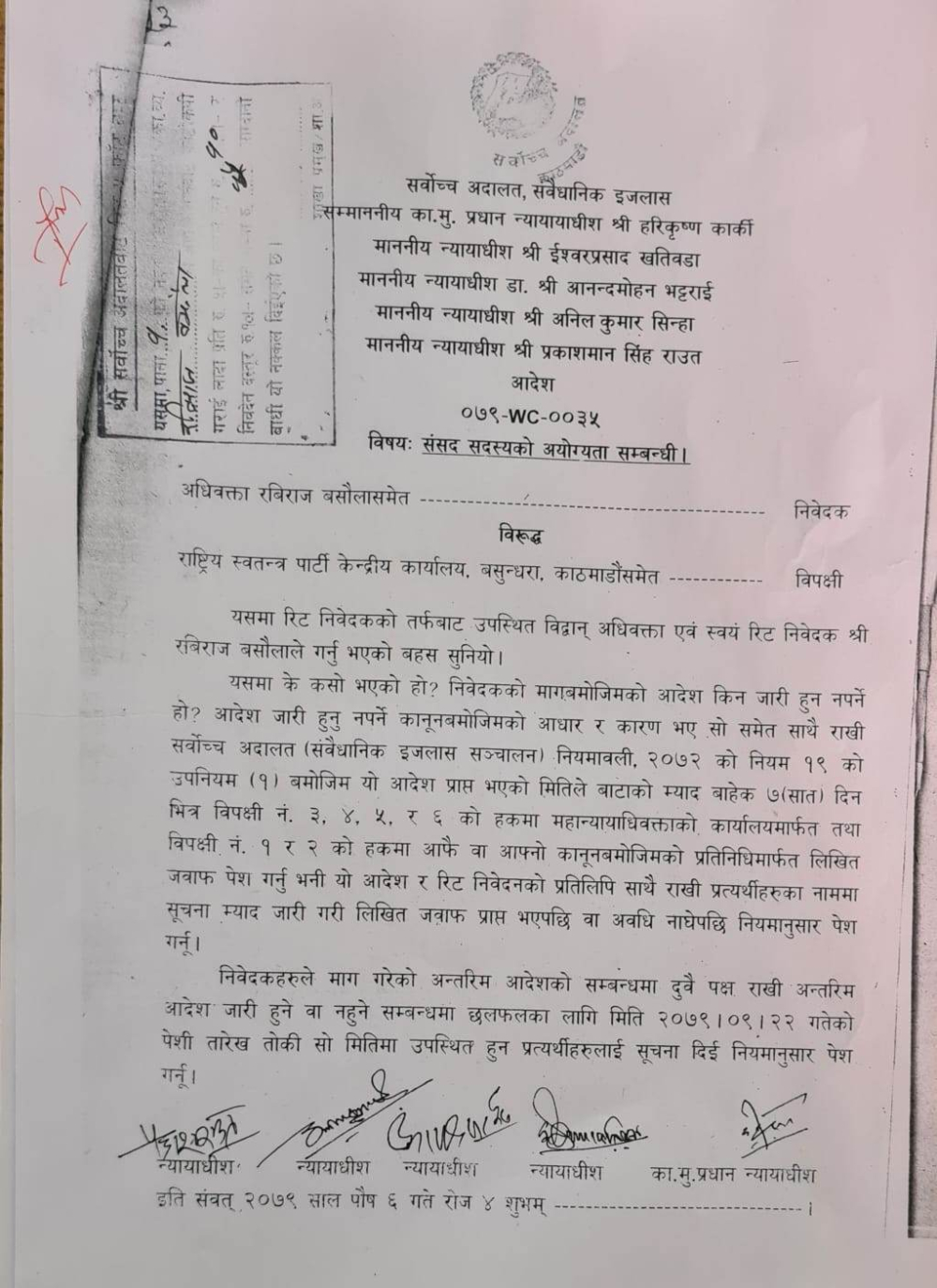 अधिवक्ता रविराज बसौलालगायतले दायर गरेको रिटमा सर्वोच्च अदालतको संवैधानिक इजलासमा ६ पुसमै सुनुवाइ भएको थियो ।
