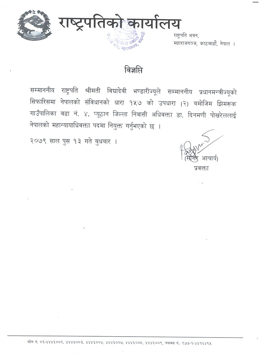 सरकारको महान्यायाधिवक्तामा डा. दिनमणी पोखरेल नियुक्त