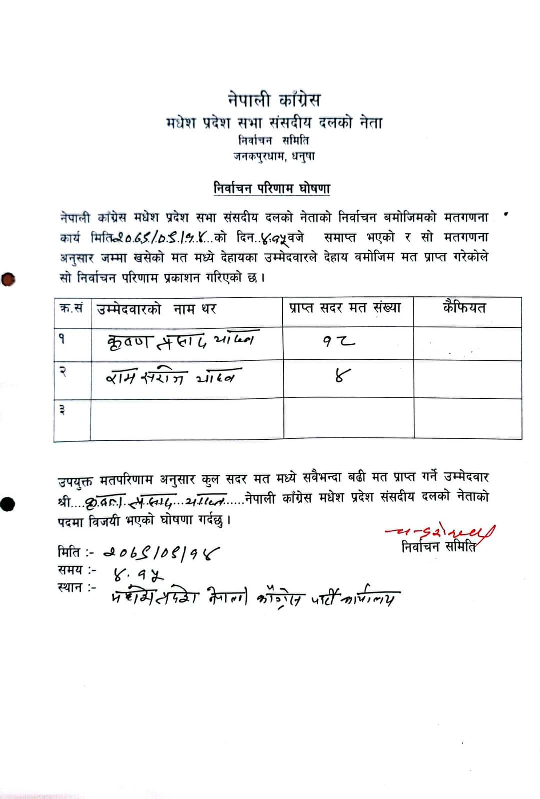 आज दिउँसो ३ बजेदेखि जनकपुरधामस्थित कांग्रेसको प्रदेश पार्टी कार्यालयमा दलको नेता चयनका लागि मतदान भएको थियो ।