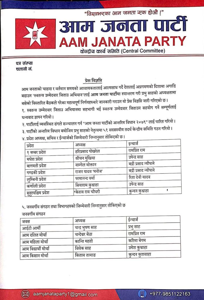 काठमाडौं, १४ पुस । गत मंसिर ४ गतेको निर्वाचनअघि नेकपा एमाले परित्याग गरेका नेता प्रभु साहले आफ्नै नेतृत्वमा आम जनता पार्टी गठन गरेका छन् ।