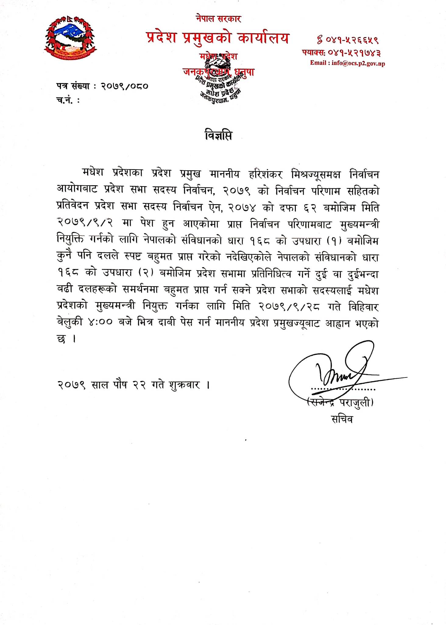 मधेस प्रदेशका प्रमुख हरिशंकर मिश्र निर्वाचन आयोगबाट प्रदेश सभा सदस्य निर्वाचन, २०७९ को निर्वाचन परिणाम सहितको प्रतिवेदन प्रदेशसभा सदस्य निर्वाचन ऐन, २०७४ को दफा ६२ बमोजिम पुस २ गते पेश हुन आएकोमा प्राप्त निर्वाचन परिणामबाट मुख्यमन्त्री नियुक्ति गर्नका लागि नेपालको संविधानको धारा १६८ को उपधारा (१) बमोजिम कुनैपनि दलले स्पष्ट बहुमत प्राप्त गरेको नदेखिएकोले संविधानको धारा १६८ को उपधारा (२) बमोजिम प्रदेशसभामा प्रतिनिधित्व गर्ने दुई वा दुईभन्दा बढी दलहरूको समर्थनमा बहुमत प्राप्त गर्न सक्ने प्रदेशसभा सदस्यलाई मधेस प्रदेशको मुख्यमन्त्री नियुक्त गर्नका लागि पुस २८ गते विहिवार बेलुकी ४ बजेभित्र दाबी पेस गर्न प्रदेश प्रमुखबाट आह्वान भएको प्रदेश प्रमुखको कार्यालयका सचिव राजेन्द्र पराजुलीले जानकारी दिएका छन् ।