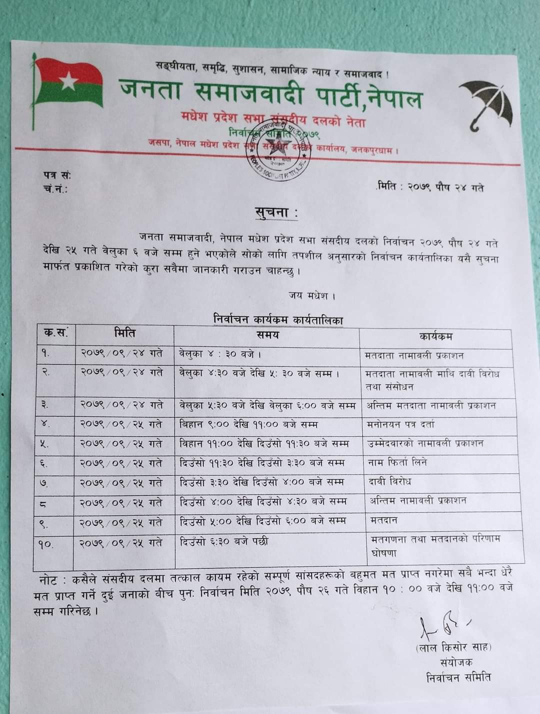 दिउँसो ४ः३० बजेसम्म उम्मेदवारको अन्तिम नामावली प्रकाशन गर्ने र साँझ ५ देखि ६ बजेसम्म मतदान गर्ने कार्यतालिका छ । मतदान सम्पन्न भएलगत्तै मतगणना गरेर परिणाम सार्वजनिक गरिने जसपा संसदीय दलको निर्वाचन समितिका संयोजक लालकिशोर साहले जानकारी दिए ।