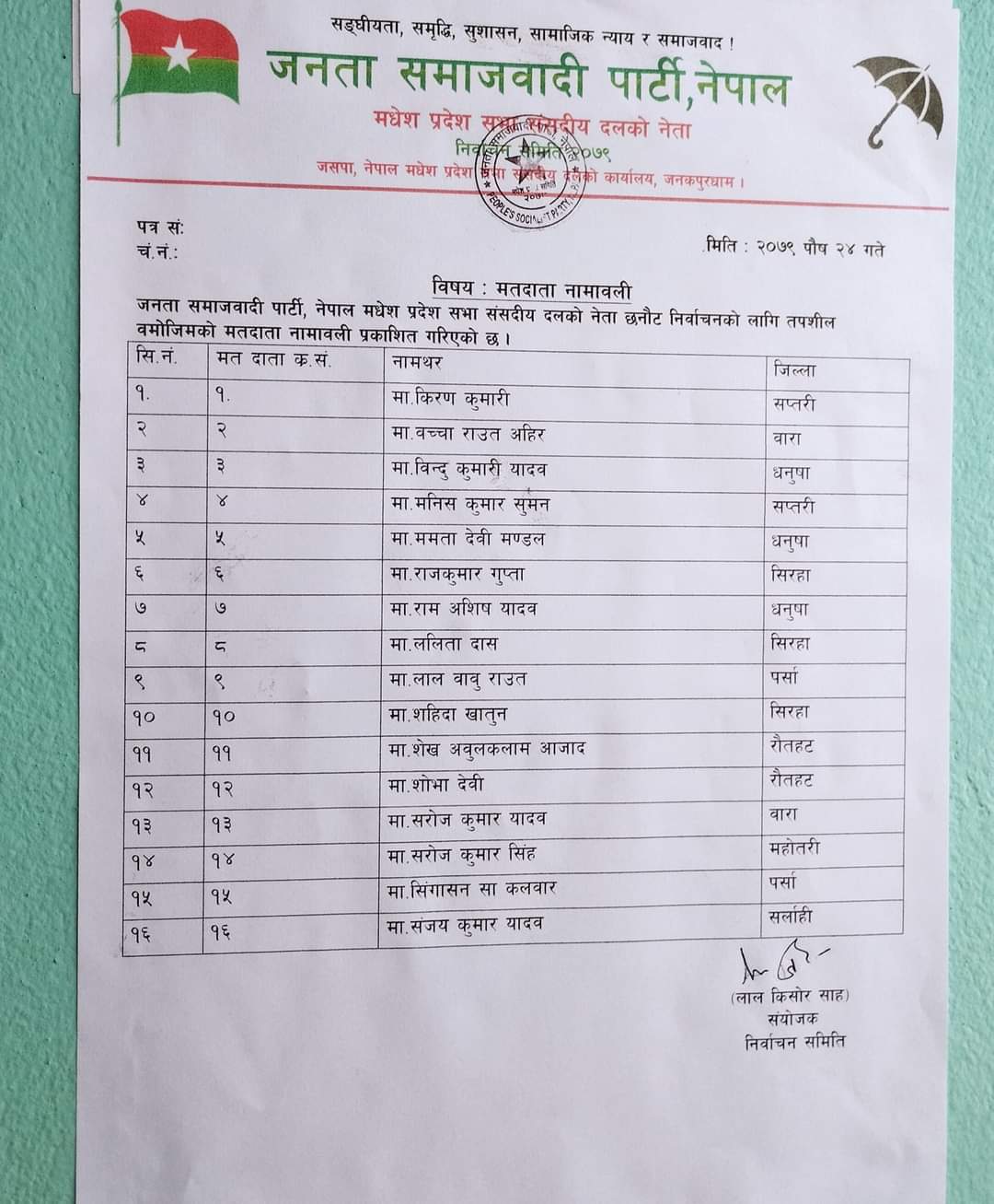 जनकपुरधाम, २४ पुस । जनता समाजवादी पार्टी नेपाल मधेस प्रदेशको संसदीय दलको नेता चयनका लागि निर्वाचन हुने भएको छ ।