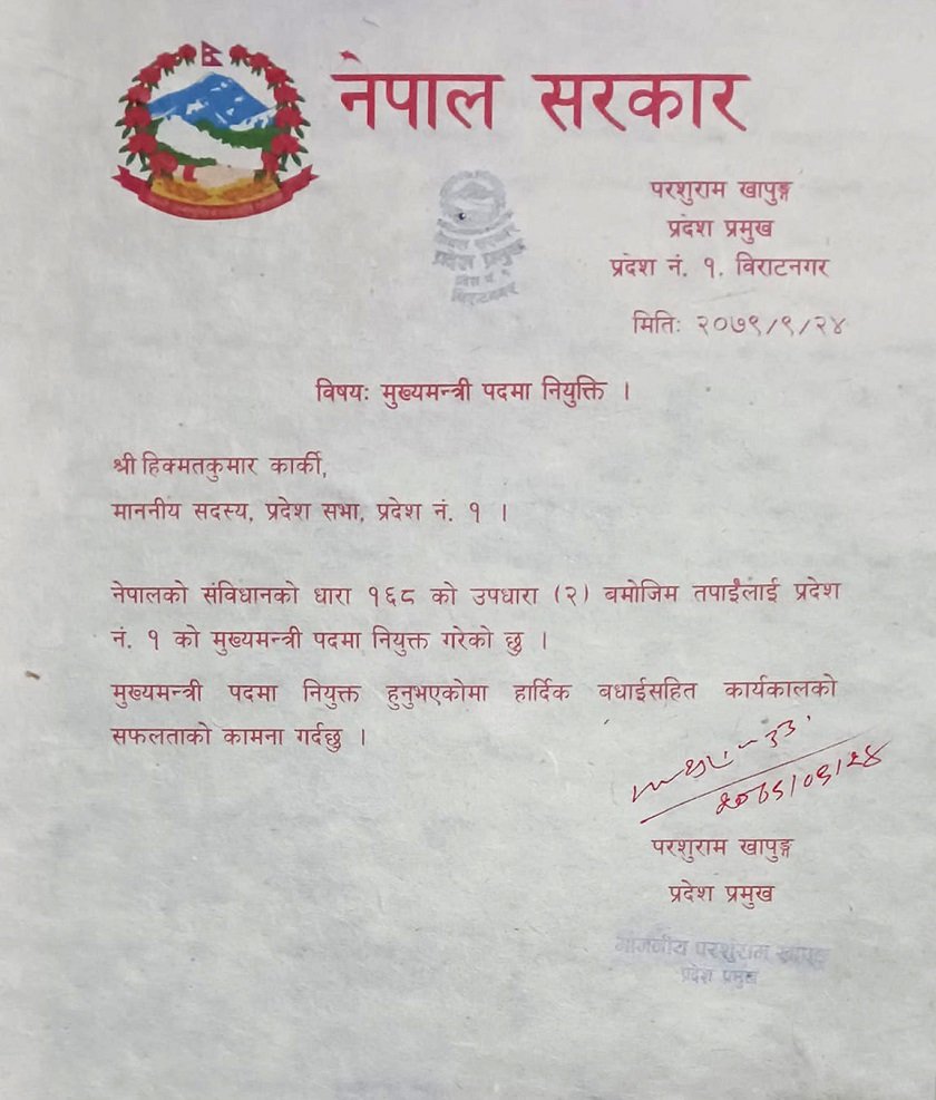 प्रदेश १ को मुख्यमन्त्रीमा हिक्मतकुमार कार्की नियुक्त