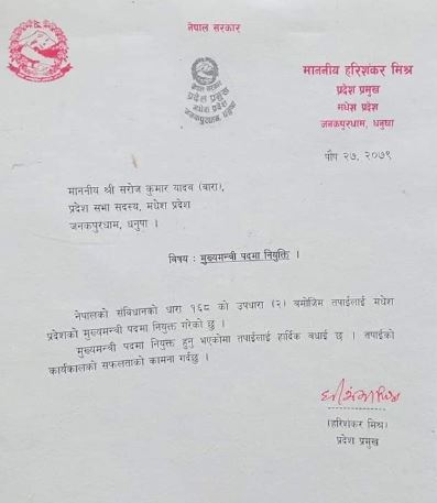 मधेस प्रदेशको मुख्यमन्त्रीमा सरोजकुमार यादव नियुक्त
