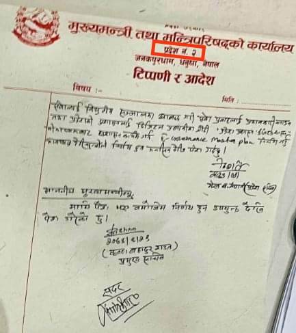 मुख्यमन्त्री यादव र प्रमुख सचिव राउतले हस्ताक्षर गरेको सो लेटरप्याडमा माथि नै प्रदेश नम्बर–२ लेखिएको स्पष्ट देखिन्छ । यसबाट प्रदेशको नामाकरण गर्नुअघिकै लेटरप्याड अहिलेसम्म पनि मुख्यमन्त्री तथा मन्त्रीपरिषद्को कार्यालयले प्रयोग गर्दै आएको स्पष्ट हुन्छ ।