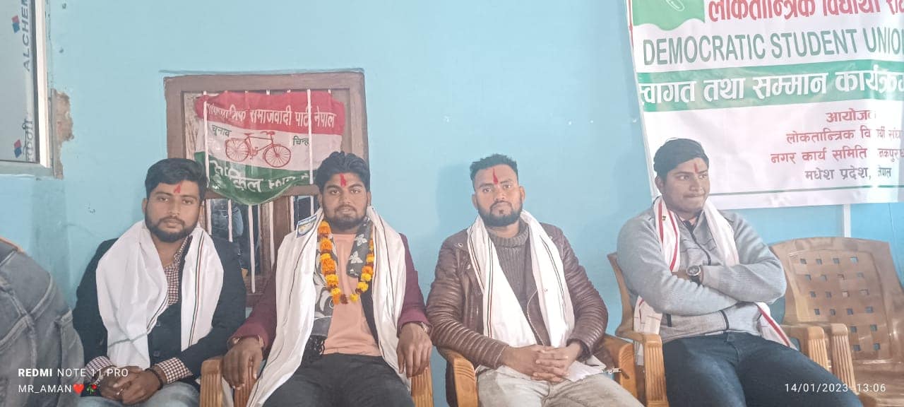 जनकपुरधाम, ३० पुस । लोकतान्त्रिक विद्यार्थी संघ नगर कार्यसमितिका पदाधिकारीलाई स्वागत तथा सम्मान गरिएको छ।