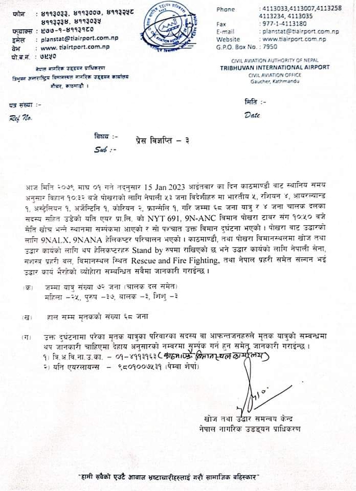 नेपाल नागरिक उड्डयन प्राधिकरणले एक विज्ञप्ती प्रकाशित गर्दै हालसम्म ६८ जनाको मृत्यु भएको पुष्टि गरेको हो ।