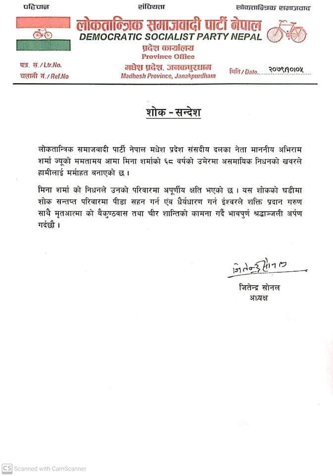 लोकतान्त्रिक समाजवादी पार्टी नेपाल मधेस प्रदेश संसदीय दलका नेतासमेत रहेका शर्माकी आमाको निधनप्रति पार्टीले गहिरो दुःख व्यक्त गरेको छ ।