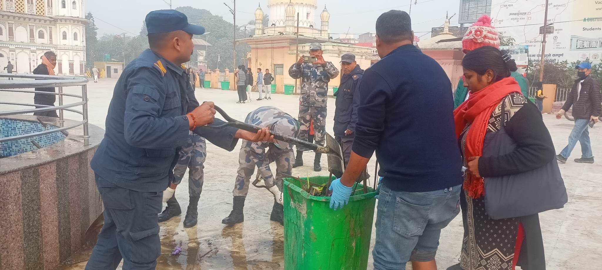 ‘सरसफाइको मामिलामा नो कम्प्रोमाइज’ भन्दै आइतबार बिहान ८ बजेदेखि जानकी मन्दिरको बृहत् सरसफाइ गरिएको हो ।