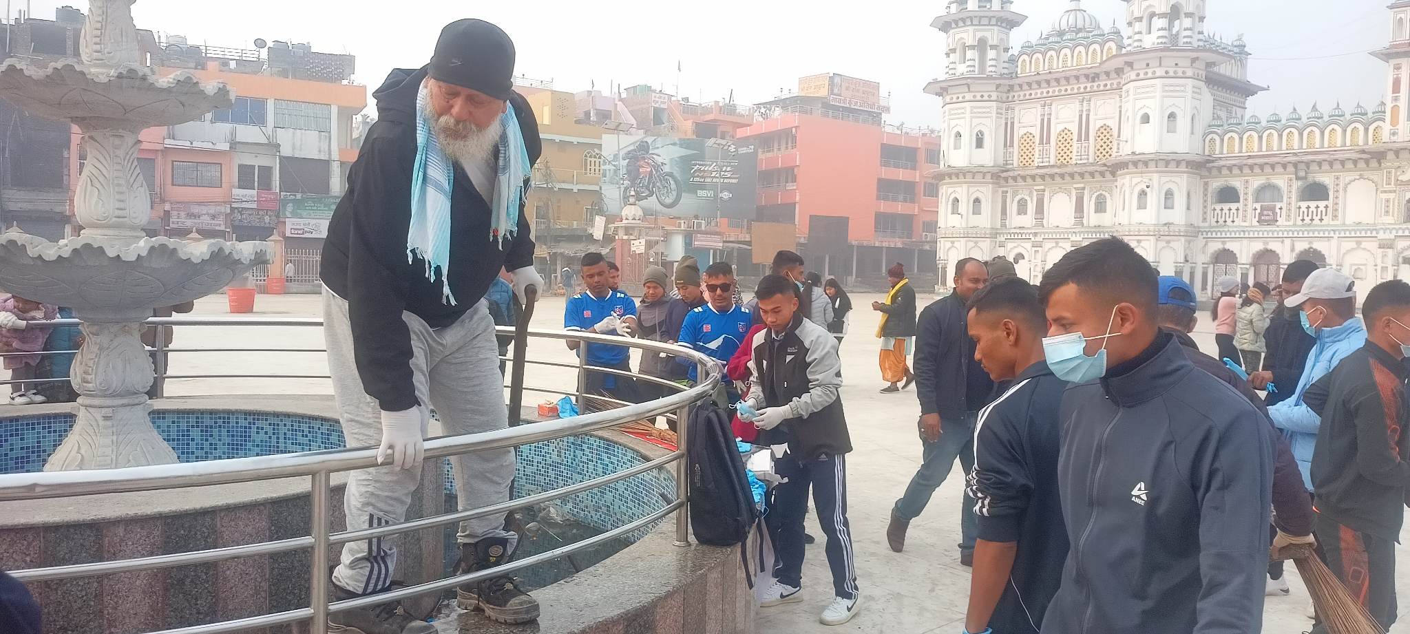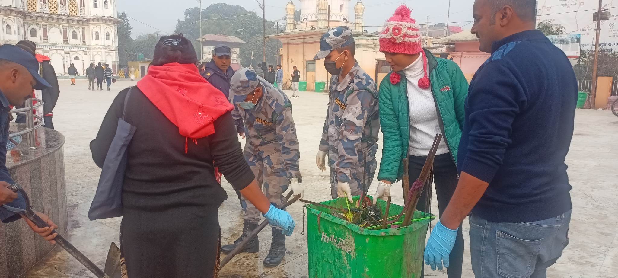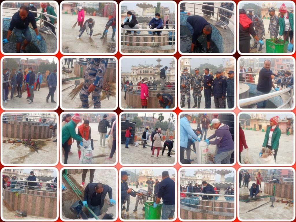 जनकपुरधाम, ८ माघ । सरसफाइ अभियानीहरुले आफ्नो सामाजिक उत्तरदायित्व बोध गर्दै आइतबार जनकपुरधामस्थित प्रसिद्ध जानकी मन्दिर र आसपासको क्षेत्रमा बृहत् सरसफाइ गरेका छन् ।