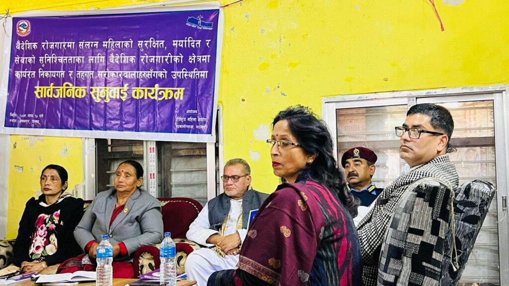 मंगलबार जनकपुरधाममा राष्ट्रिय महिला आयोगले आयोजना गरेको वैदेशिक रोजगारमा संलग्न महिलाको सुरक्षित, मर्यादित र सेवाको सुनिश्चितताका लागि वैदेशिक रोजगारीको क्षेत्रमा कार्यरत निकायगत र तहगत सरोकारवालासँगको सार्वजनिक सुनुवाइ कार्यक्रममा सहभागीहरुले सो विषयमा जोड दिएका हुन् ।