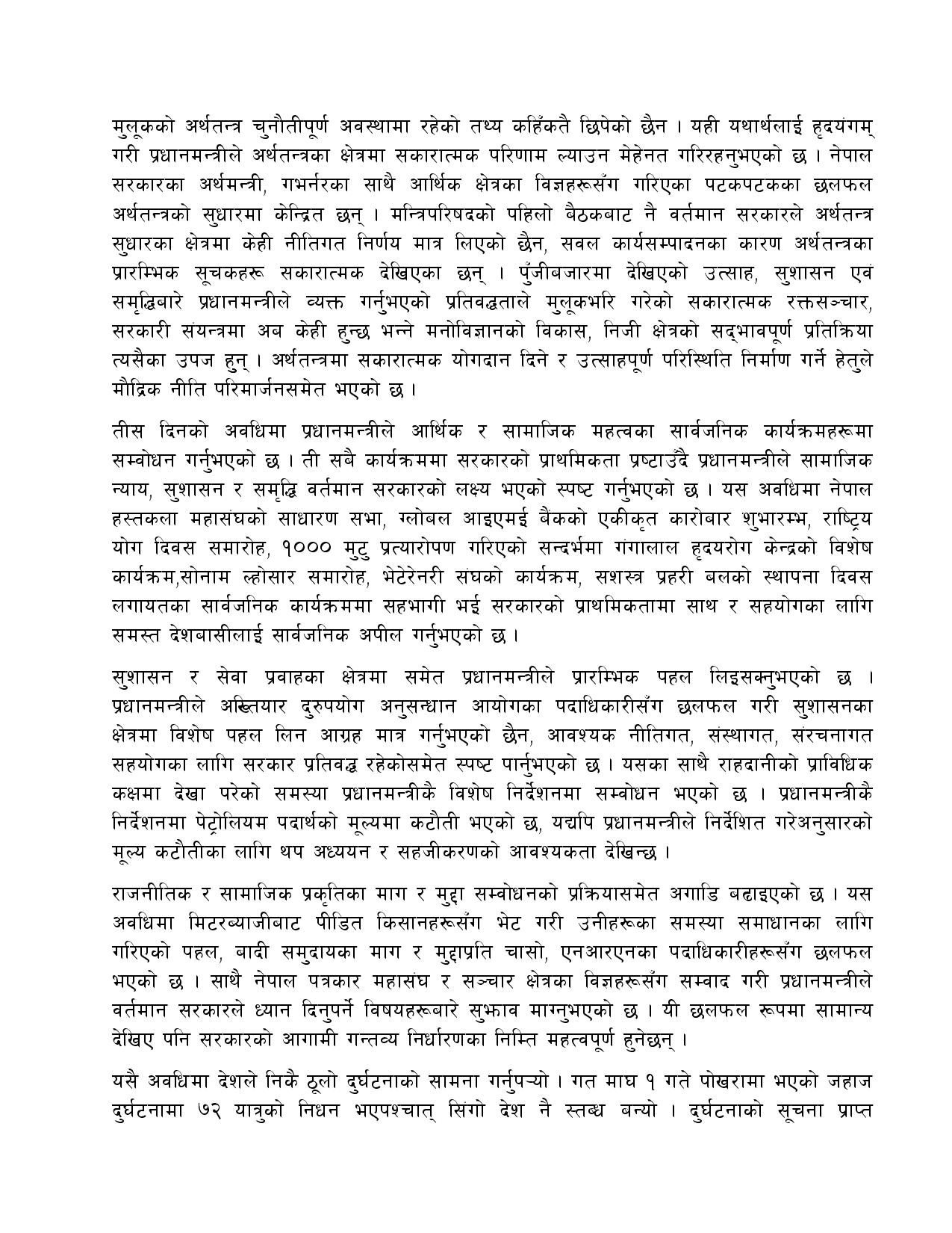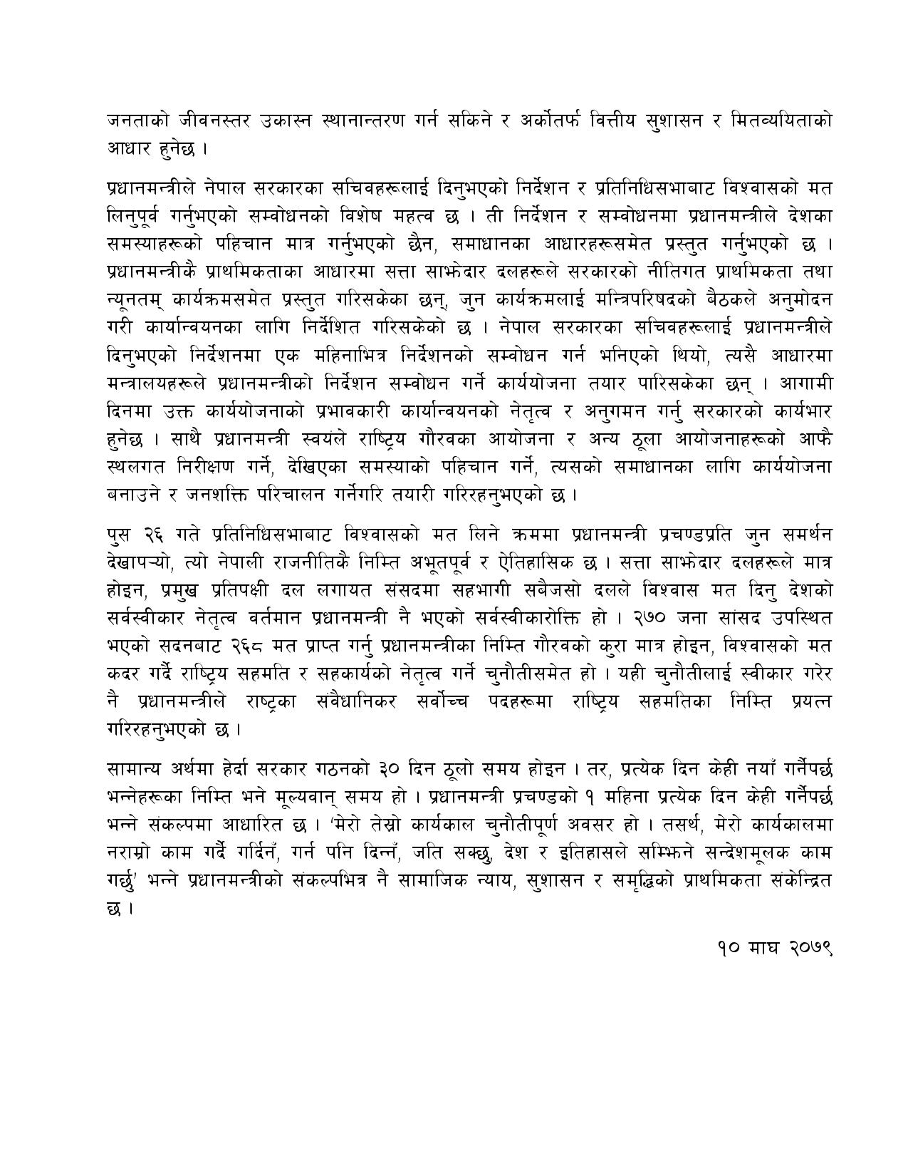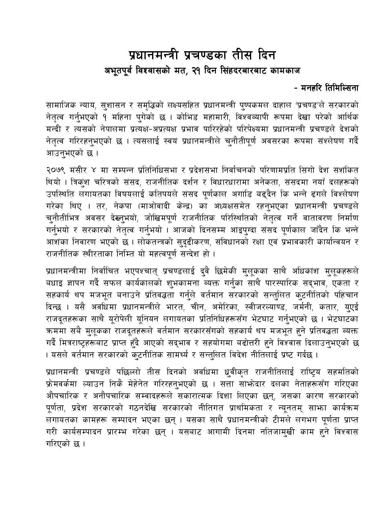 उनी गत पुस १० गते नेपालको संविधानको धारा ७६(२) बमोजिम प्रधानमन्त्रीमा नियुक्त भएका थिए । मंगलबार प्रधानमन्त्रीमा नियुक्त भएको एक महिना पुगेको अवसरमा प्रधानमन्त्री प्रचण्डले आफ्नो एक महिने कार्यप्रगति विवरण सार्वजनिक गरेका हुन् ।