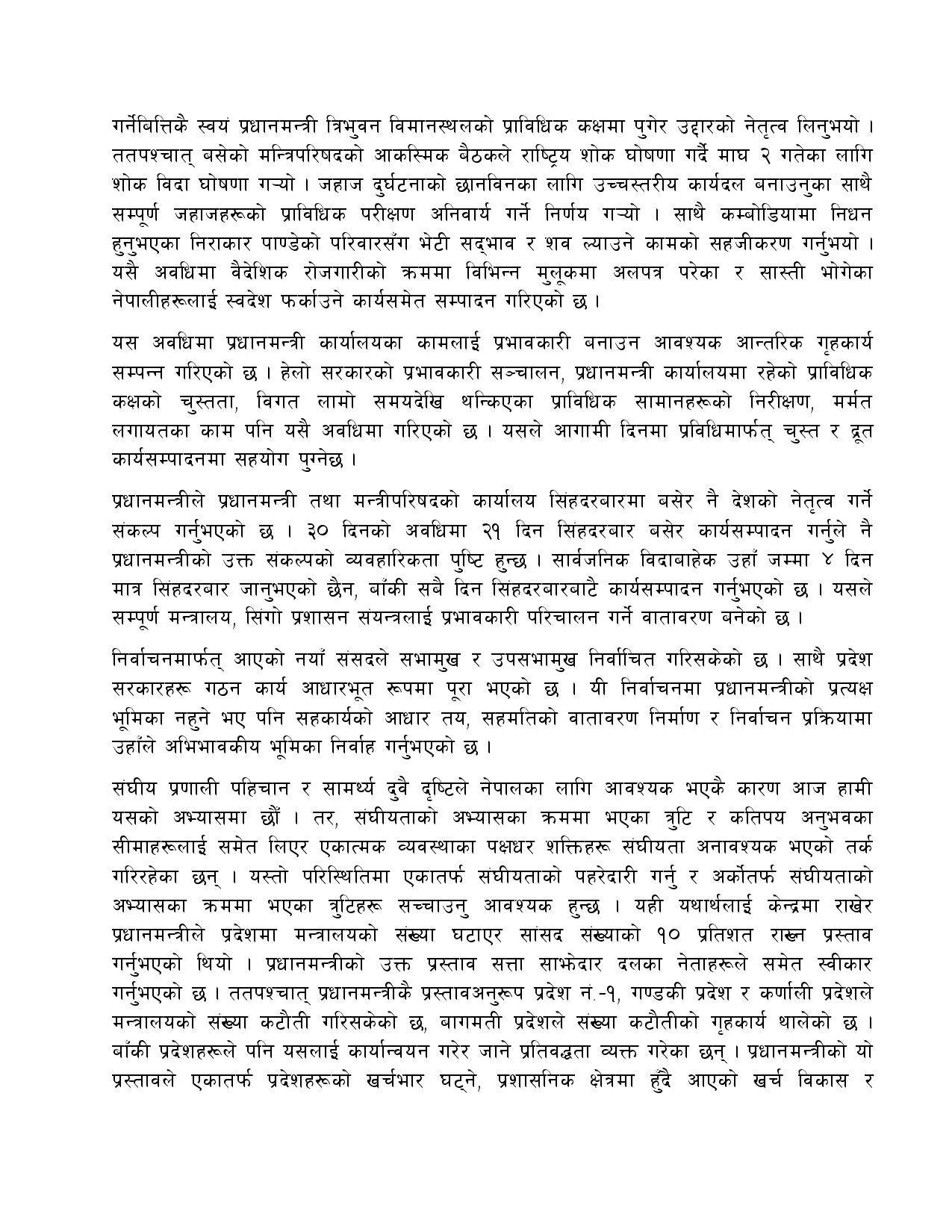 काठमाडौं, १० माघ । प्रधानमन्त्री पुष्पकमल दाहाल प्रधानमन्त्रीमा नियुक्त भएको मंगलबार एक महिना पुगेको छ । सो अवसरमा प्रचण्डले आफ्नो एक महिने कार्य प्रगति विवरण सार्वजनिक गरेका हुन् ।