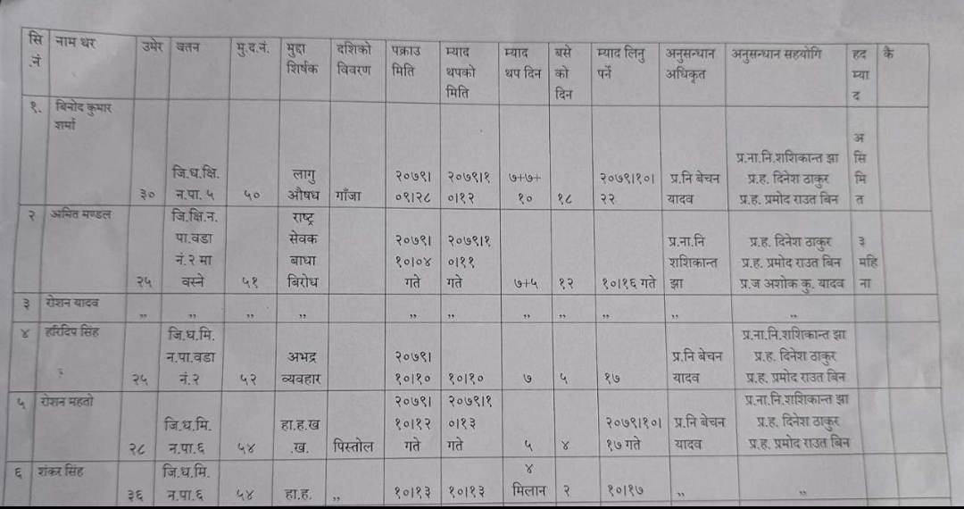 फरार हुनेहरूमा क्षीरेश्वरनाथ नगरपालिका–५ बस्ने लागूऔषध मुद्दाका अभियुक्त ३० वर्षीय विनोदकुमार शर्मा, क्षीरेश्वरनाथ नगरपालिका–२ बस्ने राष्ट्रसेवक बाधा विरोध मुद्दाका २५ वर्षीय अमित मण्डल, क्षीरेश्वरनाथ नगरपालिका–२ बस्ने राष्ट्रसेवक बाधा विरोध मुद्दाका २५ वर्षीय रोशन यादव, मिथिला नगरपालिका–२ बस्ने अभद्र व्यवहार मुद्दाका २५ वर्षीय हरिदीप सिंह, मिथिला नगरपालिका–६ बस्ने हातहतियार तथा खरखजाना मुद्दाका २८ वर्षीय रोशन महतो र मिथिला नगरपालिका–६ बस्ने हातहतियार तथा खरखजाना मुद्दाका ३६ वर्षीय शंकर सिंह रहेका छन् ।