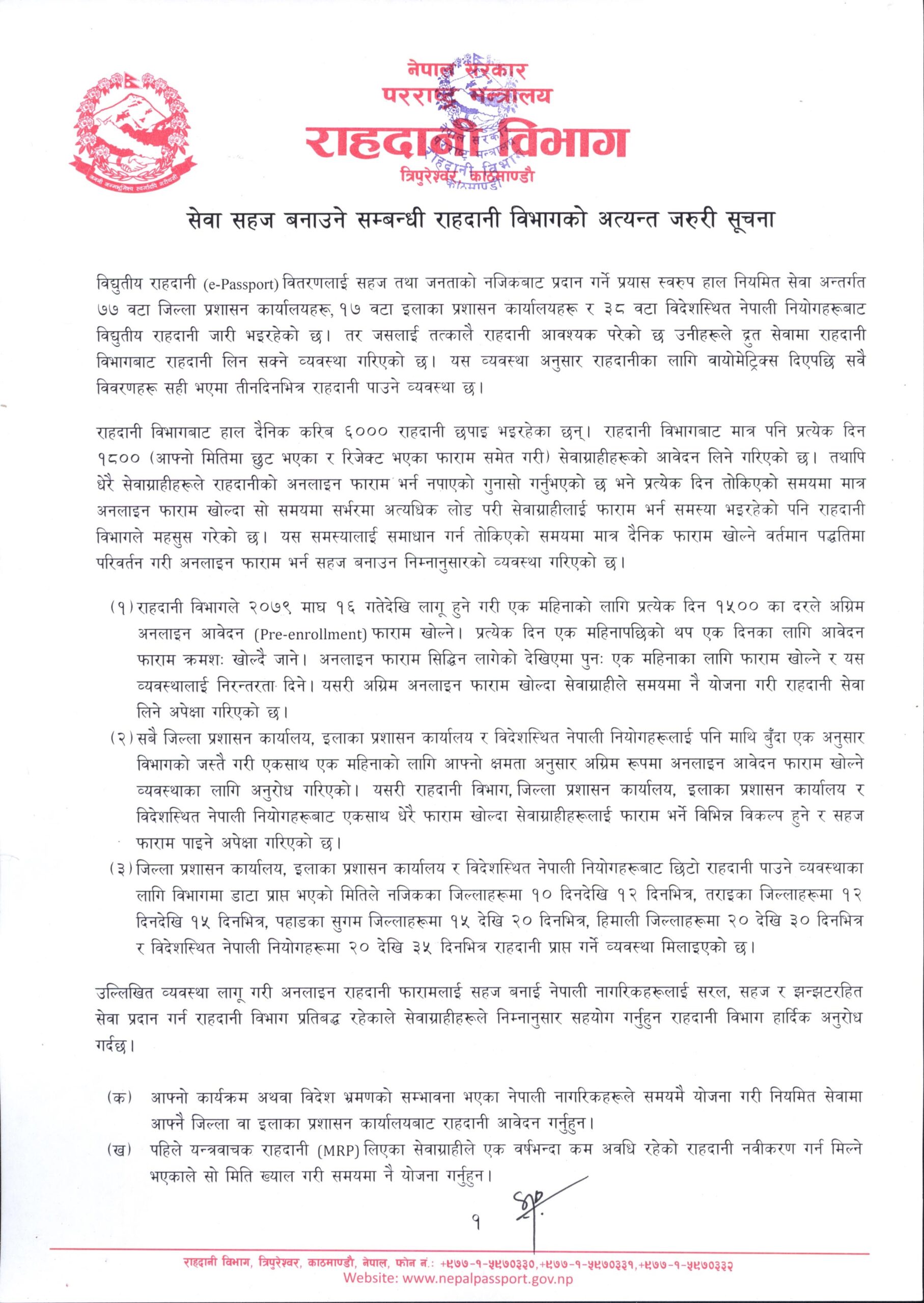 राहदानी बनाउन एक महिना अघि नै अग्रिम अनलाइन आवेदन दिन मिल्ने