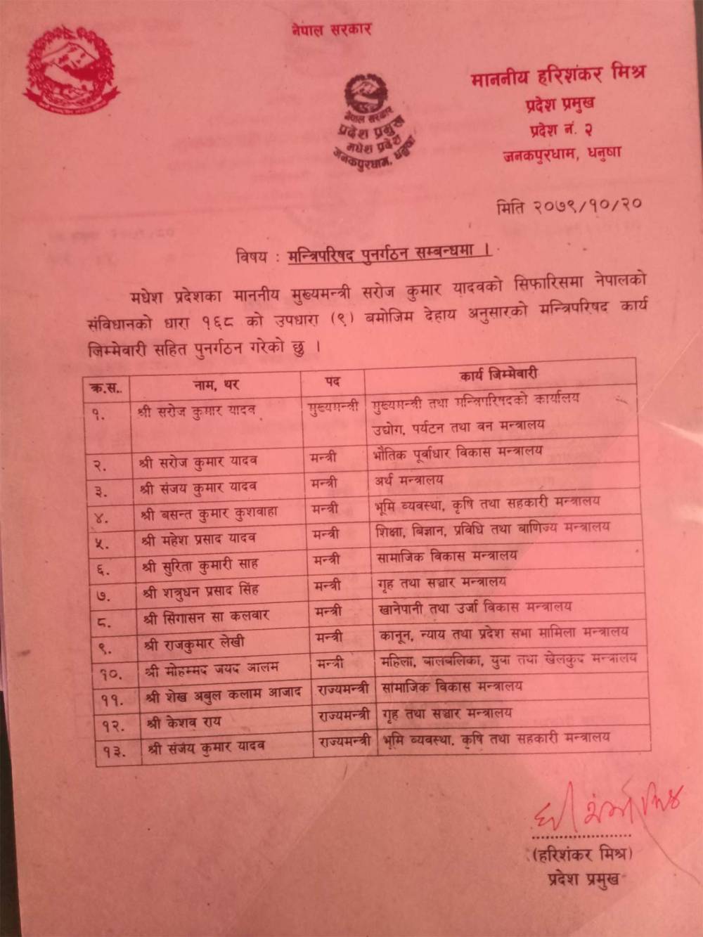 यसअघि मुख्यमन्त्री यादवले माघ १२ गते नेकपा एमाले संसदीय दलका नेता सरोजकुमार यादवलाई भौतिक पूर्वाधार विकास मन्त्रालय, जनता समाजवादी पार्टी नेपालका संजय यादवलाई अर्थ मन्त्रालय र जनमत पार्टीका बसन्त कुशवाहालाई भूमि व्यवस्था, कृषि तथा सहकारी मन्त्रालयको जिम्मेवारी दिइसकेका छन् ।