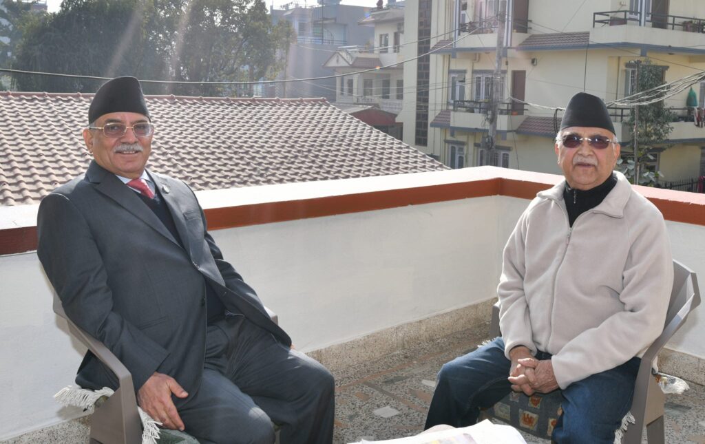 काठमाडौं, २५ माघ । प्रधानमन्त्री पुष्पकमल दाहाल प्रचण्ड र नेकपा एमालेका अध्यक्ष केपी शर्मा ओलीबीच भेटवार्ता भएको छ । अध्यक्ष ओलीलाई भेट्न प्रधानमन्त्री प्रचण्ड बालकोट पुगेका थिए ।