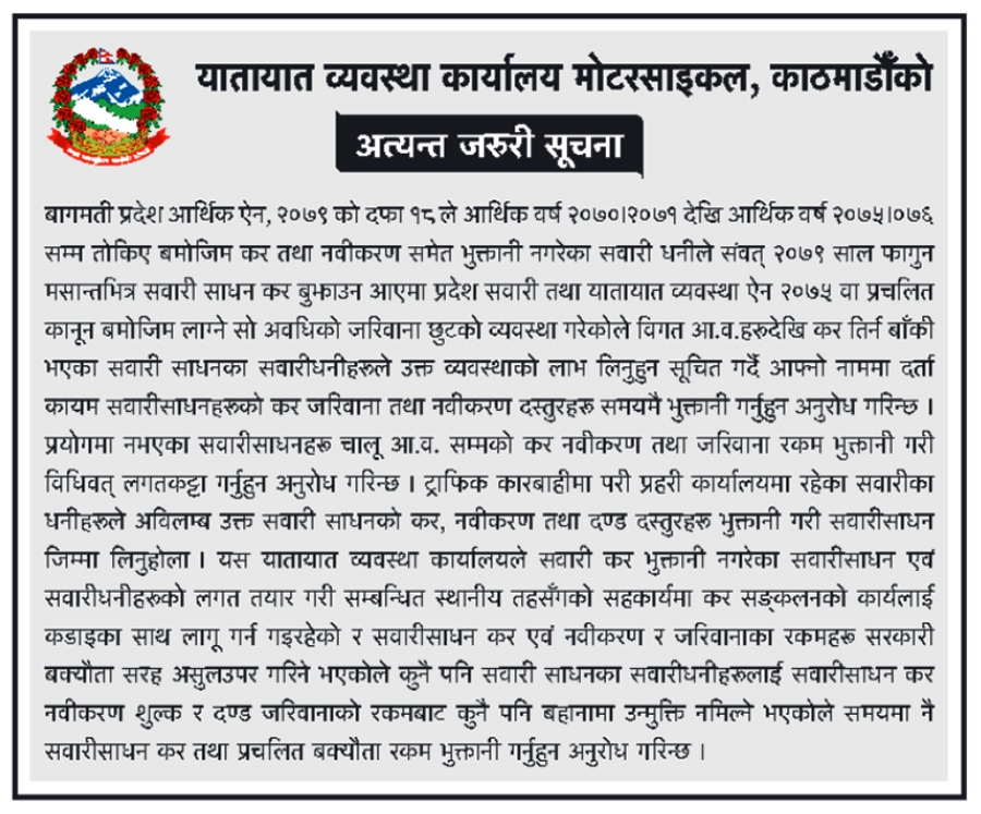 बिहीबार यातायात व्यवस्था कार्यालय, काठमाडौंले एक सूचना प्रकाशित गर्दै मोटरसाइकलको कर बुझाएमा पाँच वर्षको जरिवाना छूट दिने व्यवस्था गरिएको जनाएको हो ।