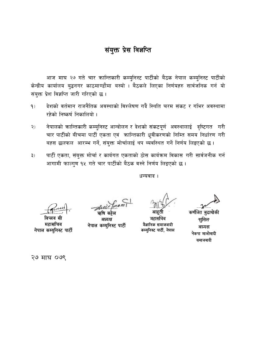 ‘नेपालको क्रान्तिकारी कम्युनिस्ट आन्दोलन र देशको संकटपूर्ण अवस्थालाई दृष्टिगत गरी चार पार्टीको बीचमा पार्टी एकता एवं क्रान्तिकारी ध्रुवीकरणको निम्ति समय निर्धारण गरी बहस छलफल आरम्भ गर्ने, संयुक्त मोर्चालाई थप व्यवस्थित गर्ने निर्णय लिइएको छ’बैठकपछि जारी संयुक्त विज्ञप्तिमा भनिएको छ ।