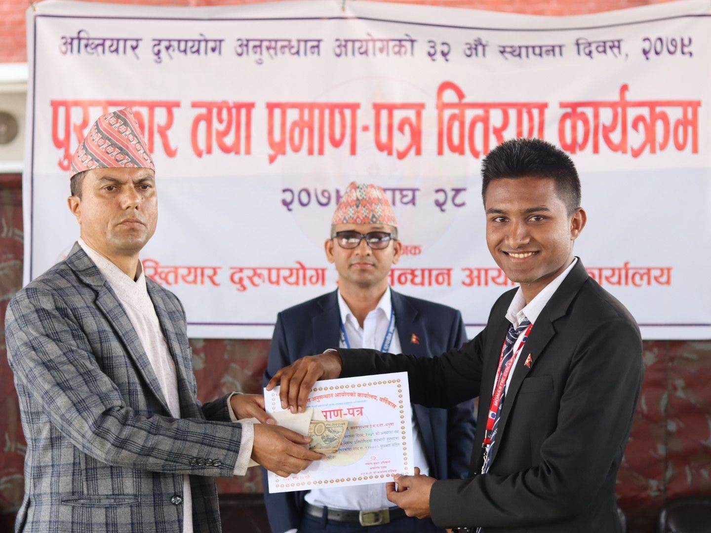 आयोगले प्रतियोगिताका विजयी सहभागी÷खेलाडीहरु तथा रक्तदान कार्यक्रममा सहभागी भई रक्तदान गर्ने व्यक्तिहरुलाई पुरस्कार तथा प्रमाणपत्र वितरणसमेत गरेको अख्तियारका उपसचिव कृष्ण प्रसाद हुमागाईले बताए ।