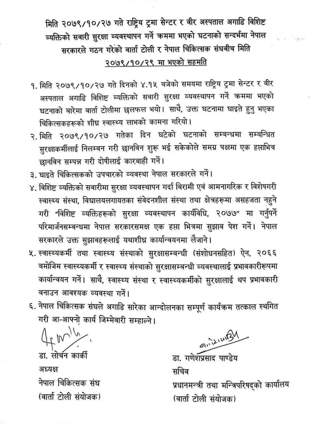 सहमति पत्रमा सरकारको तर्फबाट प्रधानमन्त्री कार्यालयका सचिव डा. गणेशप्रसाद पाण्डेय र चिकित्सकको तर्फबाट नेपाल चिकित्सक संघका अध्यक्ष डा. लोचन कार्कीले हस्ताक्षर गरेका छन् ।