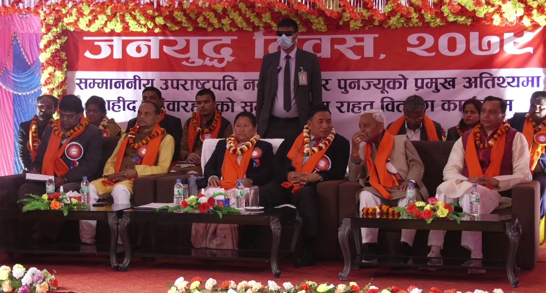सोमबार मधेस प्रदेशको गृह तथा सञ्चार मन्त्रालय मातहतको मधेशी शहीद प्रतिष्ठानले आयोजना गरेको २८औँ जनयुद्ध दिवस कार्यक्रममा प्रमुख अतिथिको आसनबाट सम्बोधन गर्दै उपराष्ट्रपति पुनले शान्ति सम्झौताको मुख्य दुईटा काम अझै बाँकी रहेको बताएका हुन् ।